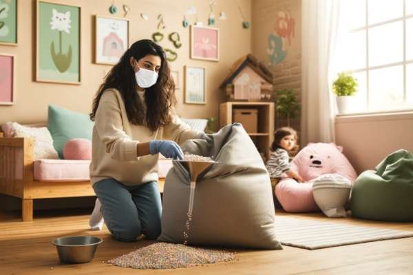 Have all your tools — like a funnel, measuring cup, and vacuum — within reach to streamline the process and keep things tidy. This setup not only makes refilling the bean bag straightforward but also keeps your child’s room safe and clean, limiting any potential mess.